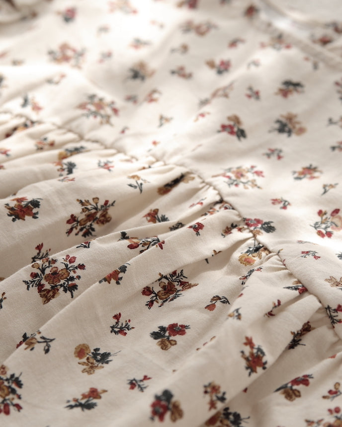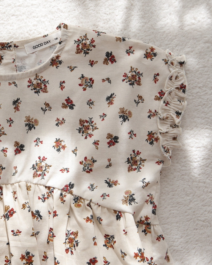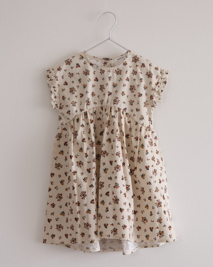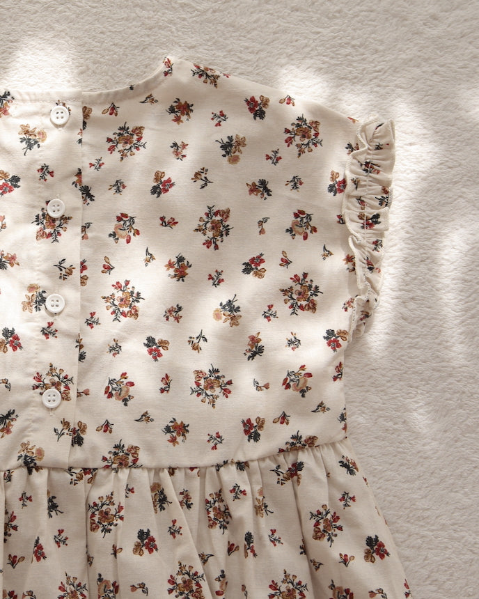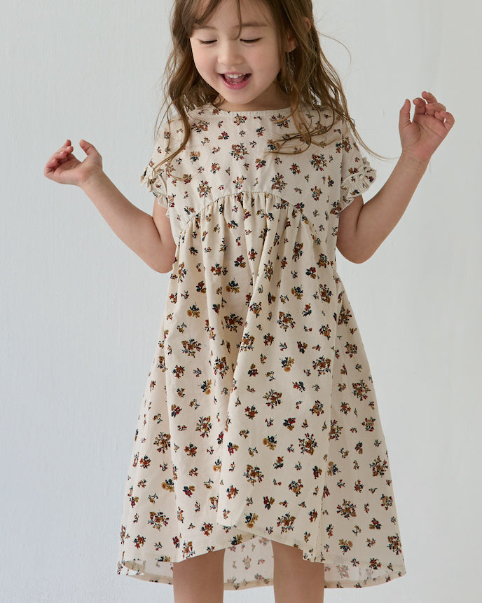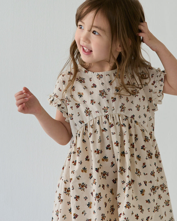 繊細な小花柄とナチュラルなベースカラーが織りなす、まるで物語の中のお嬢様のような佇まい。綿100%のさらりとした素材は、通気性がよくて肌ざわりもやさしく、着心地も抜群です。ふんわりと広がるAラインシルエットと控えめなフリル袖が、甘すぎず上品にまとまるポイント。