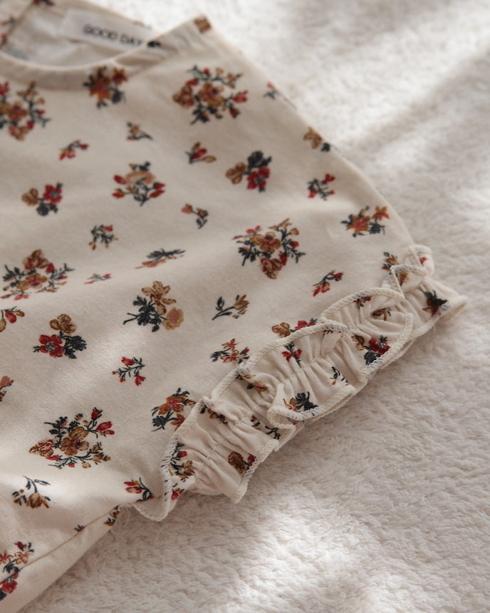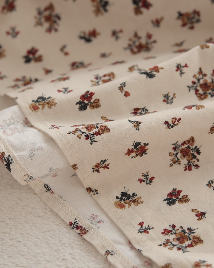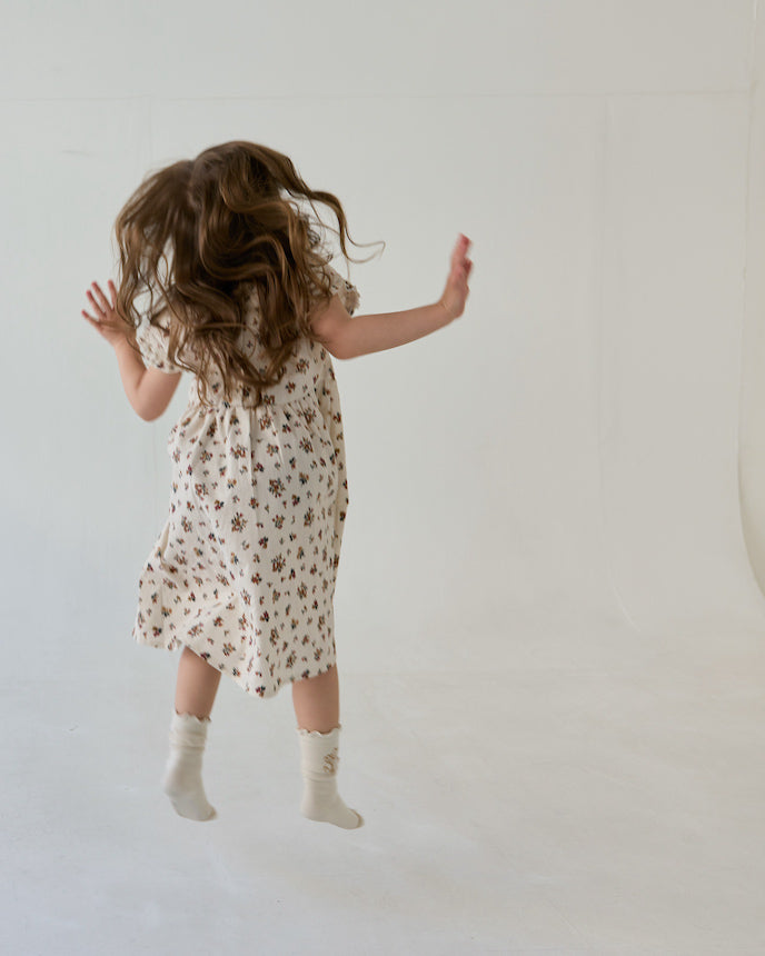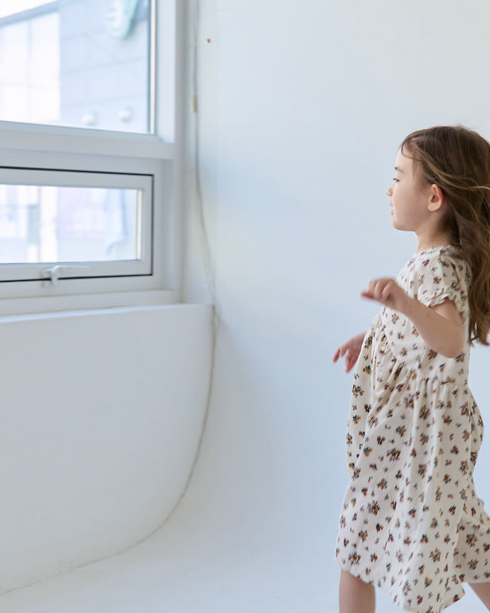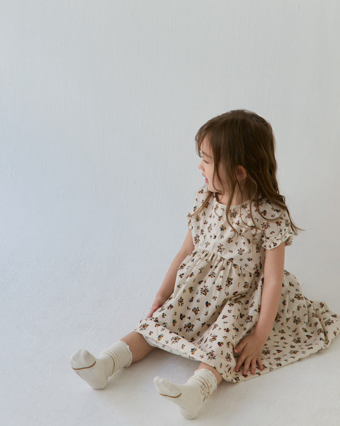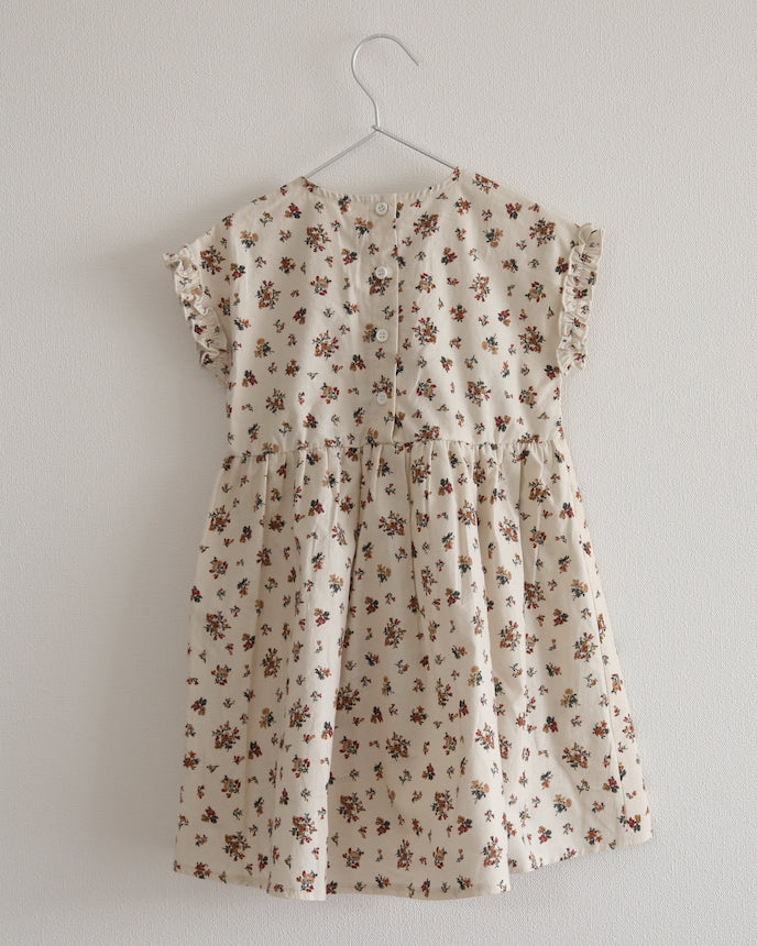 繊細な小花柄とナチュラルなベースカラーが織りなす、まるで物語の中のお嬢様のような佇まい。綿100%のさらりとした素材は、通気性がよくて肌ざわりもやさしく、着心地も抜群です。ふんわりと広がるAラインシルエットと控えめなフリル袖が、甘すぎず上品にまとまるポイント。