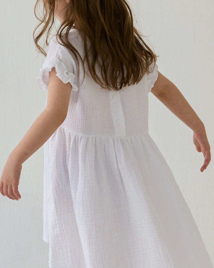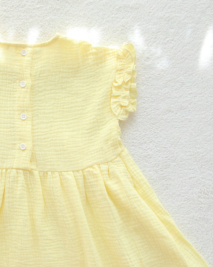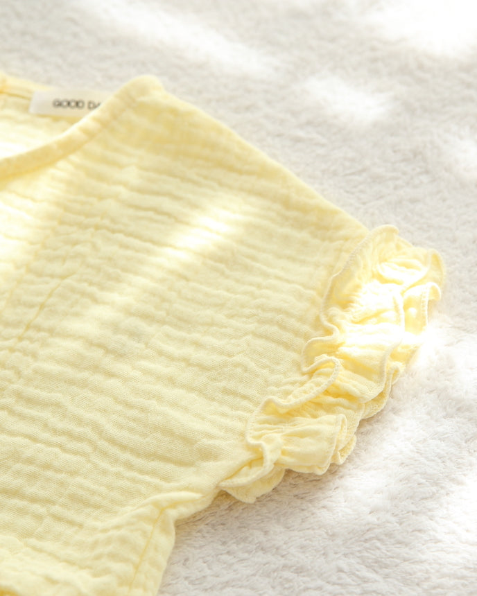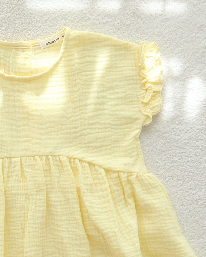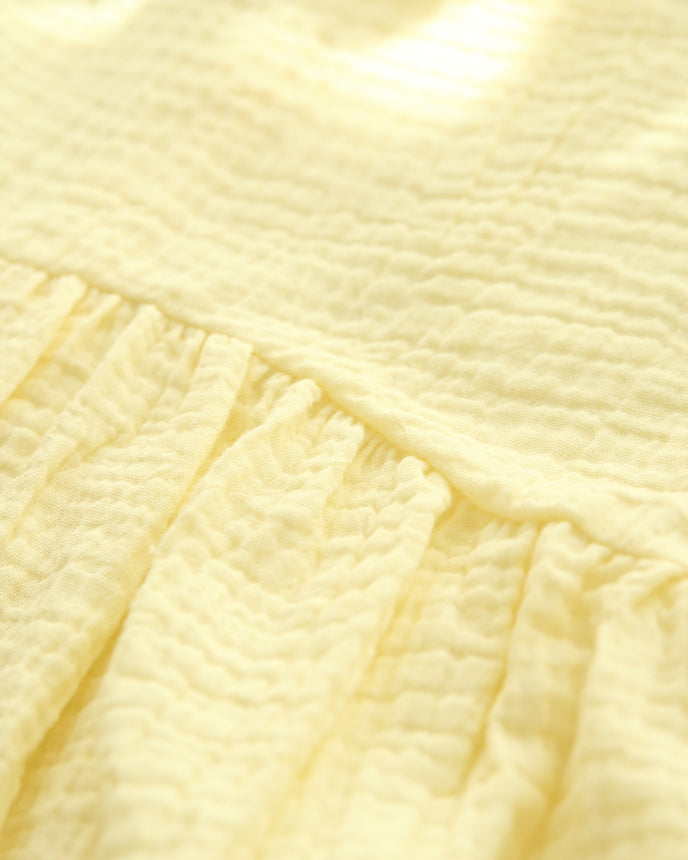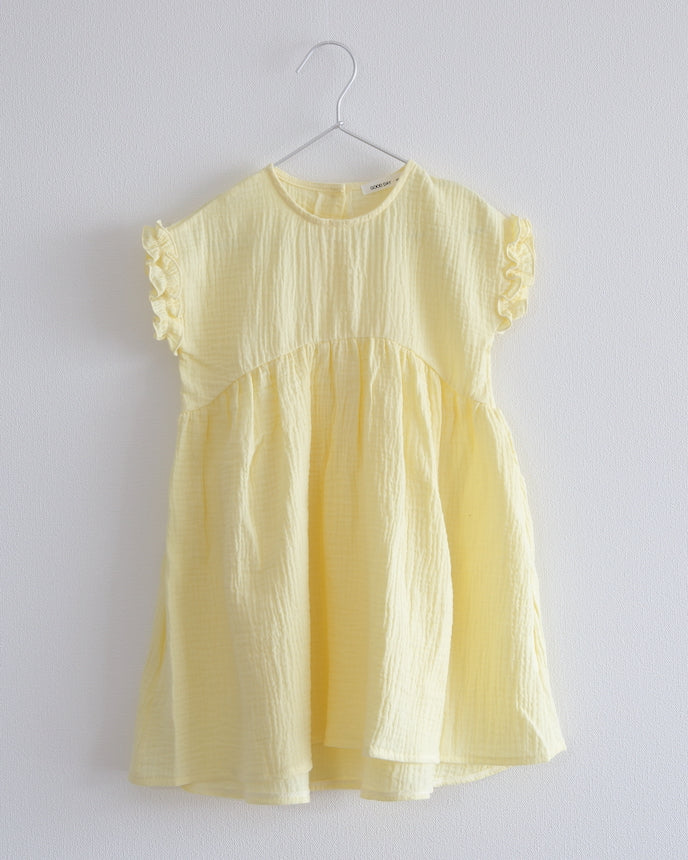 二重ガーゼならではのふわっと軽い着心地は、汗ばむ季節もさらりと快適に。 動くたびにゆれるラウンドシルエットと、袖のフリルがさりげない華やかさを添えてくれるから、特別な日にも、いつもの日常にも、自然と手が伸びるワンピースです。