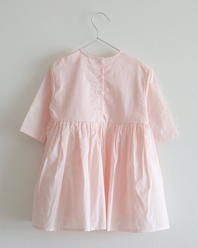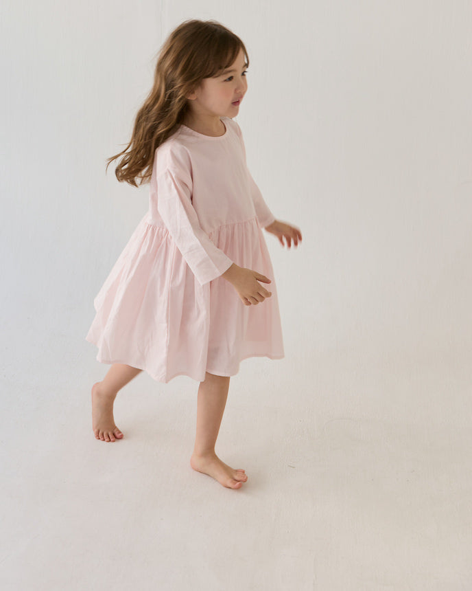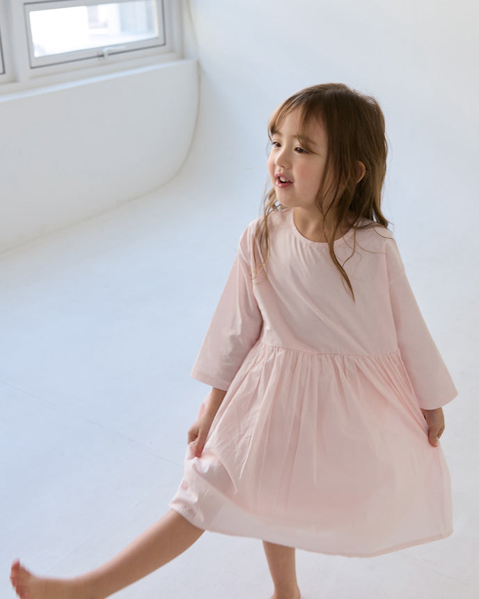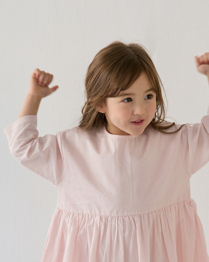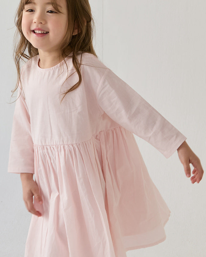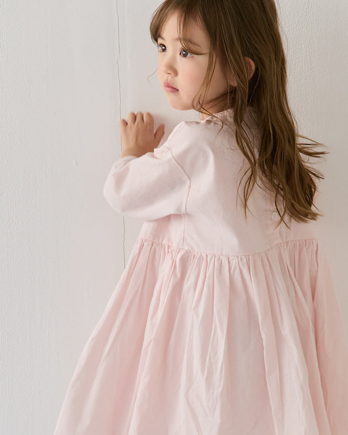 薄手の綿素材を贅沢に二枚重ねて、空気をはらんだような軽やかなシルエットに仕上げました。たっぷりギャザーと高めの切り替えが、動くたびにふんわり広がって、どの角度から見てもかわいい、思わず写真を撮りたくなる、春夏の主役ワンピースです。清涼感のある素材で肌離れがよく、汗ばむ季節も快適。着心地に敏感なお子さまにも嬉しいポイントです。