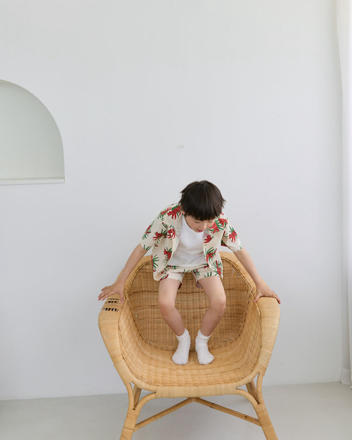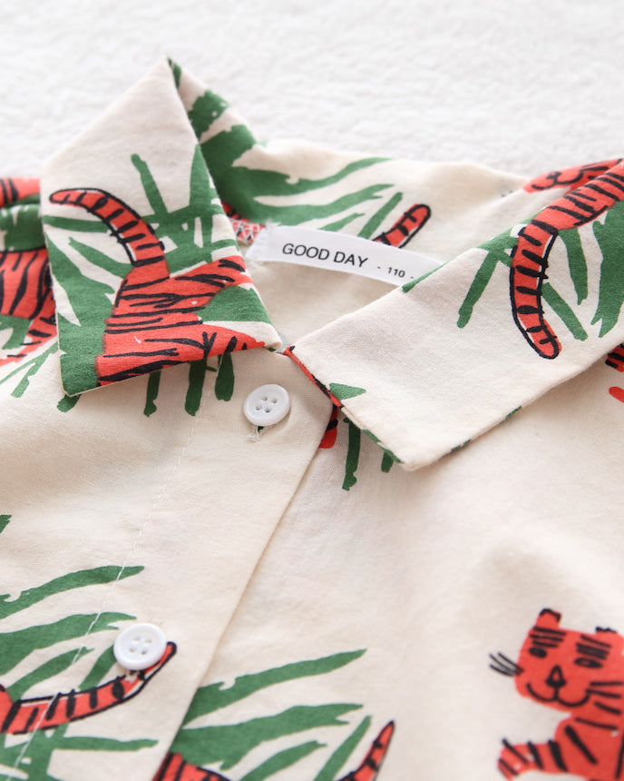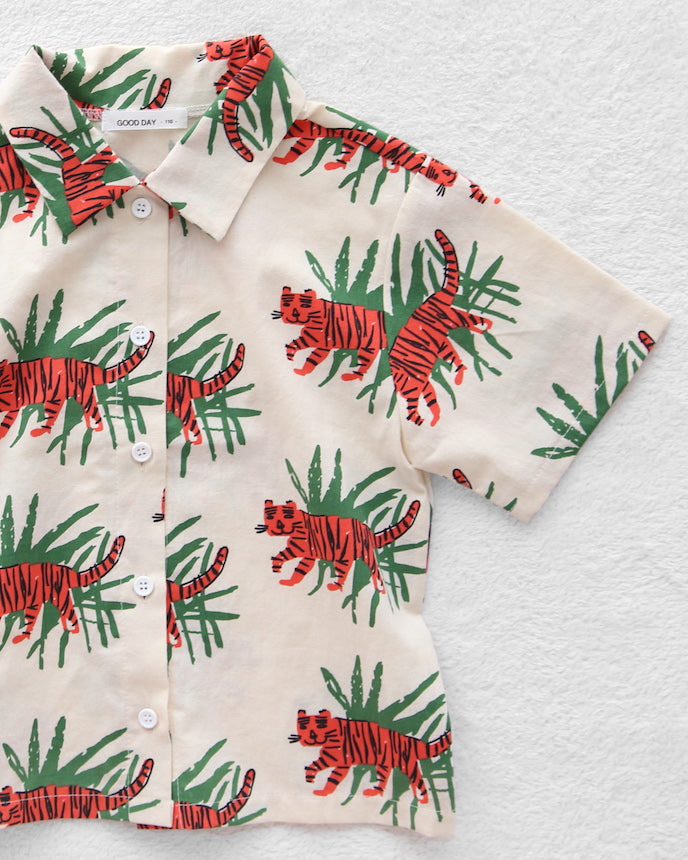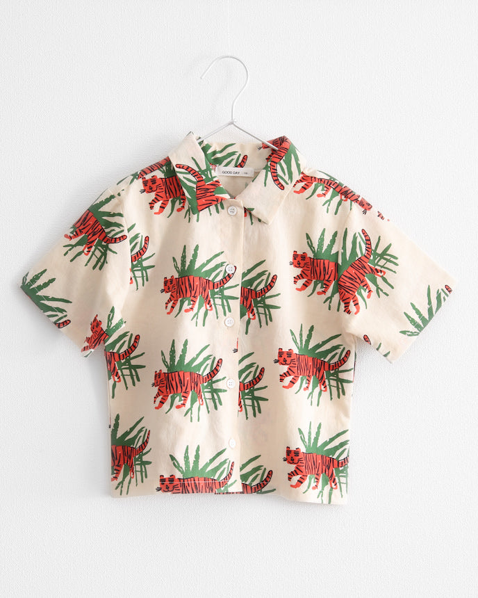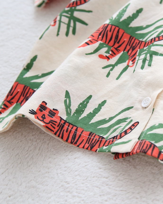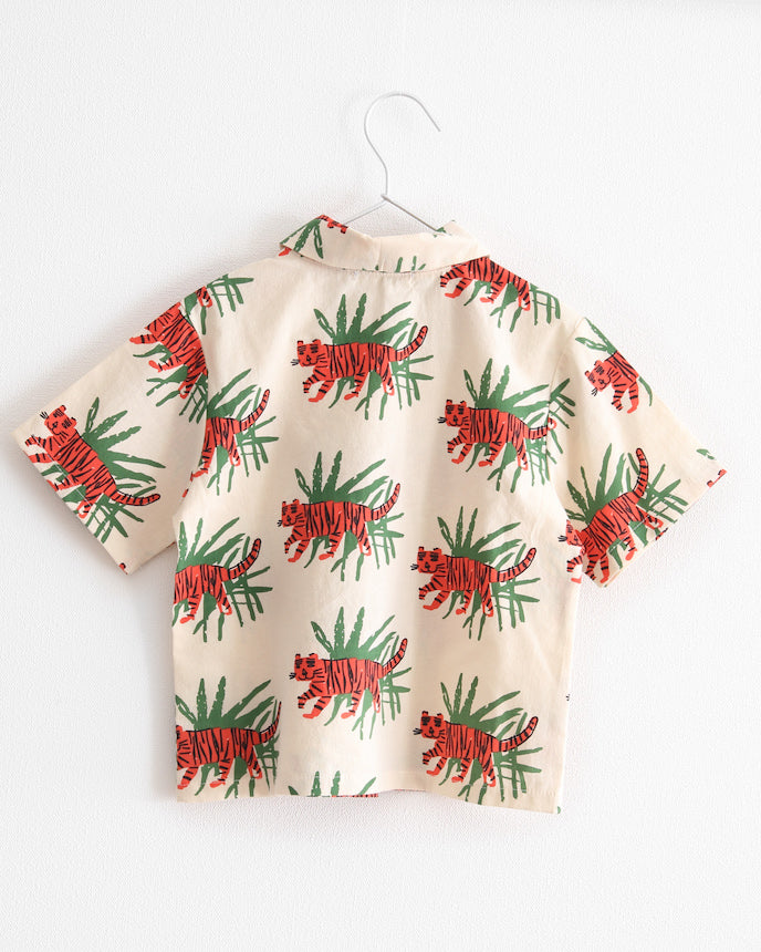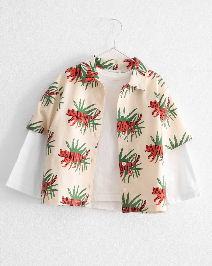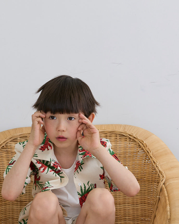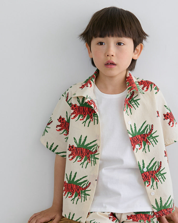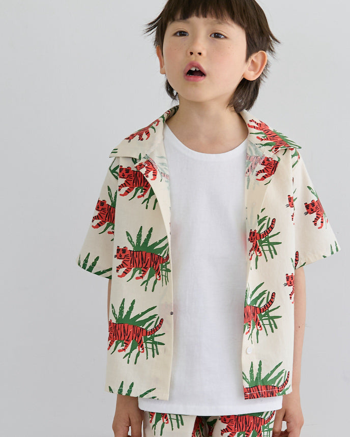 ジャングルの中を歩くトラたちが印象的な、夏気分を盛り上げる総柄シャツ。大胆でユニークなプリントながら、ベースはナチュラルな生成りカラーで、派手すぎず着やすいデザインです。トラ×リーフのコンビネーションが、子どもたちの好奇心をくすぐる1枚!