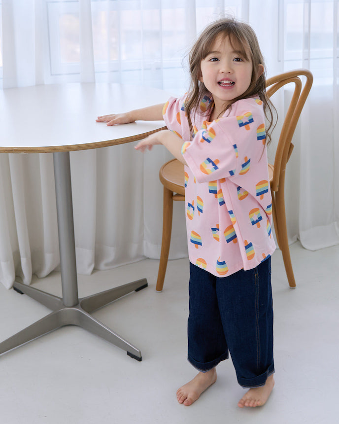 短袖剪裁併用冰棒縫製。五顏六色的冰棒讓你感到甜蜜,會讓孩子們興奮不已。薄薄的 100% 棉材質在出汗的夏天非常有用。不僅推薦日常使用,也推薦外出使用。