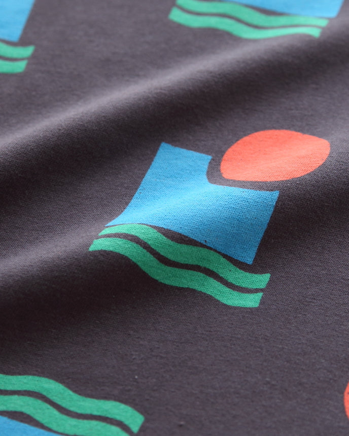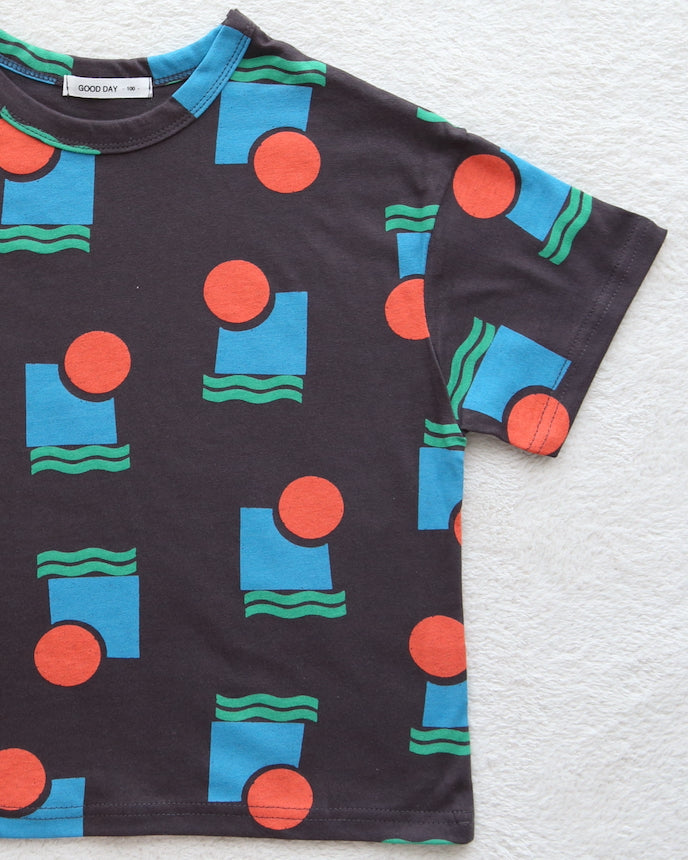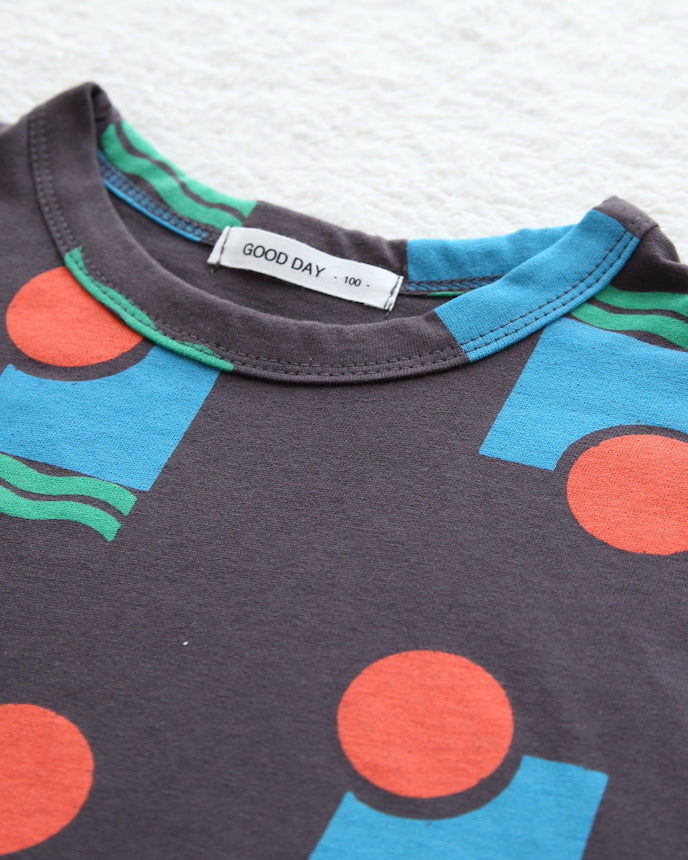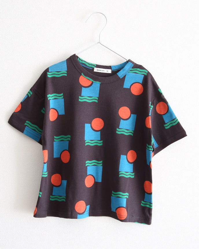 短袖剪裁和縫製的不同形狀的獨特圖案將吸引您的眼球。這是一款具有獨特色彩的作品,可以抓住孩子們的心。薄薄的 100% 棉材質在出汗的夏天非常有用。不僅推薦日常使用,也推薦外出使用。
