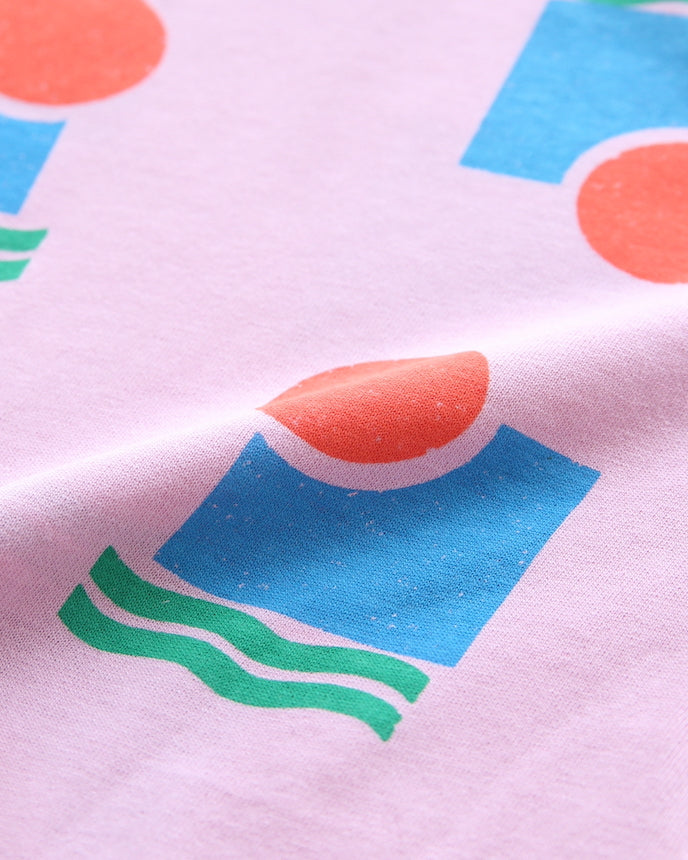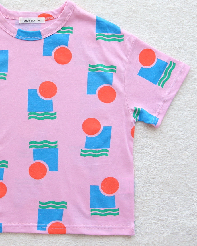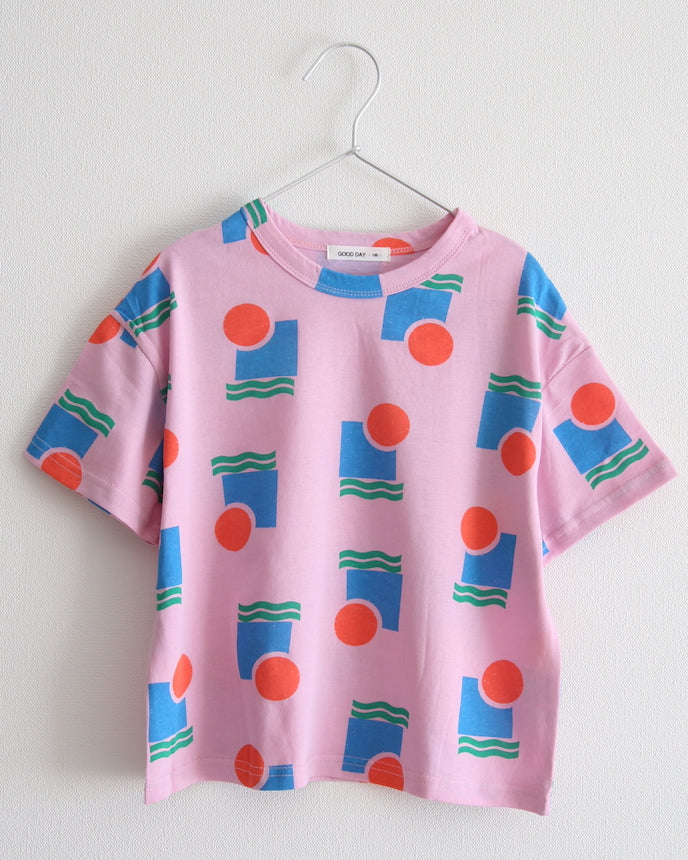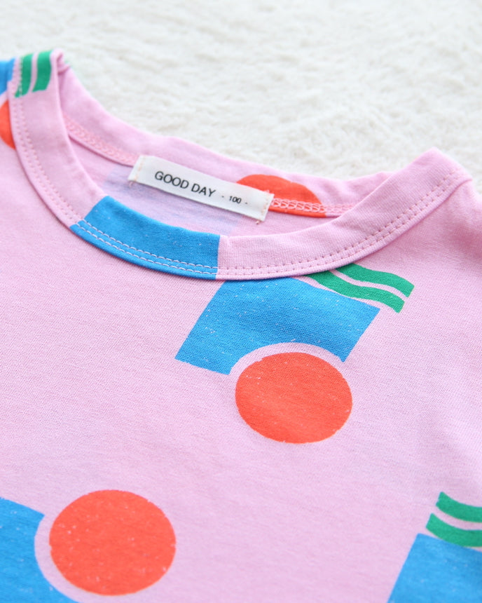 短袖剪裁和縫製的不同形狀的獨特圖案將吸引您的眼球。這是一款具有獨特色彩的作品,可以抓住孩子們的心。薄薄的 100% 棉材質在出汗的夏天非常有用。不僅推薦日常使用,也推薦外出使用。