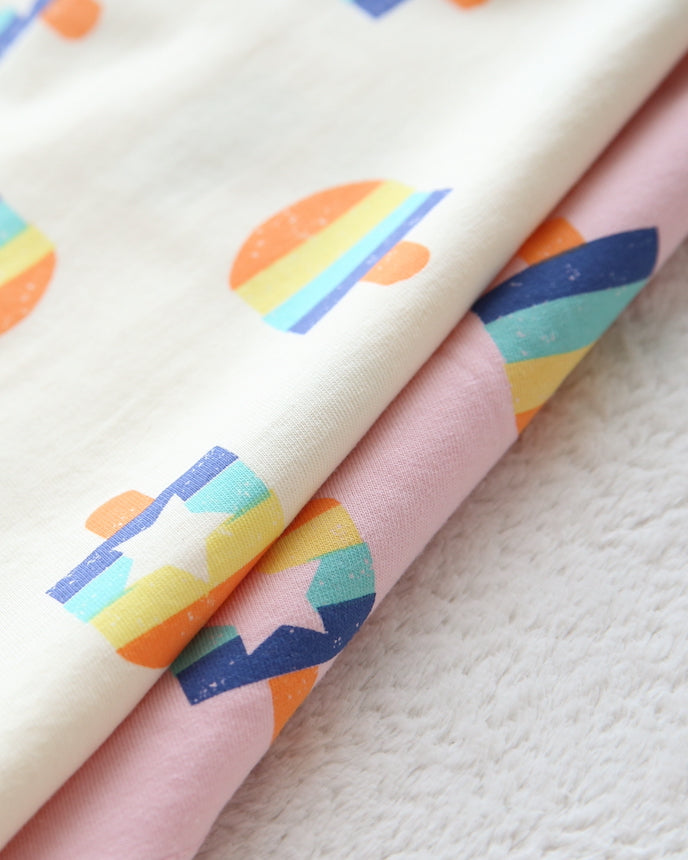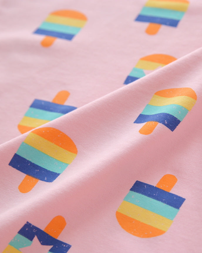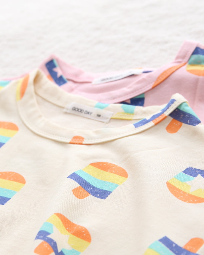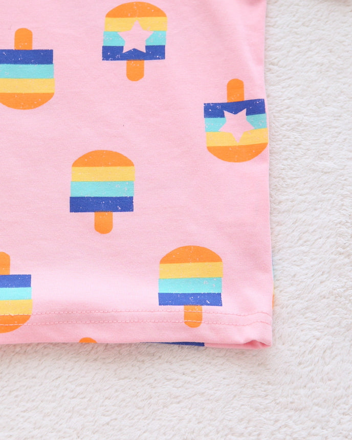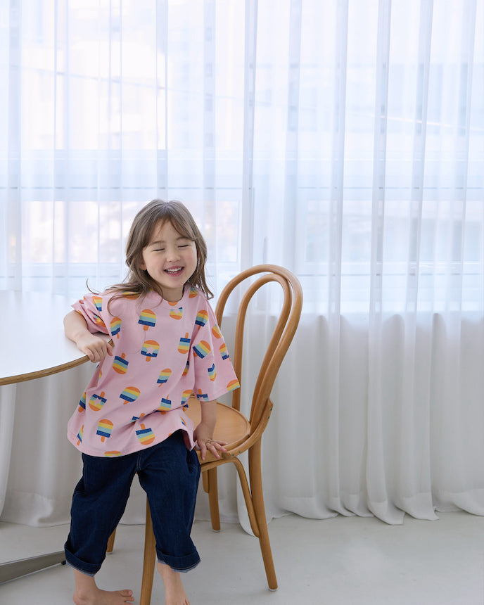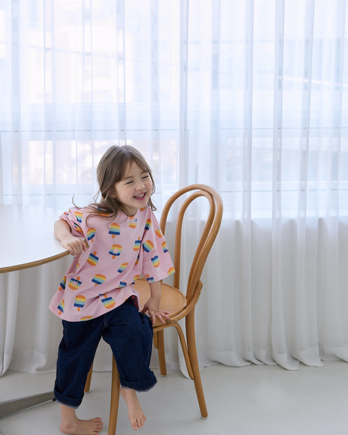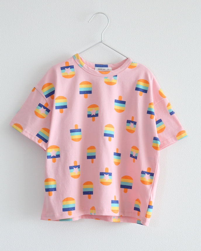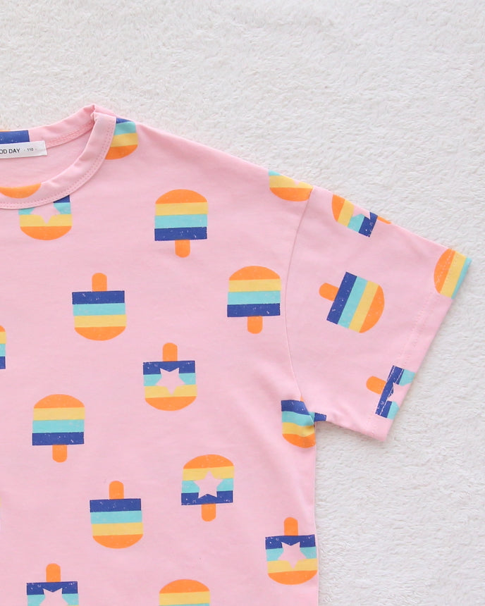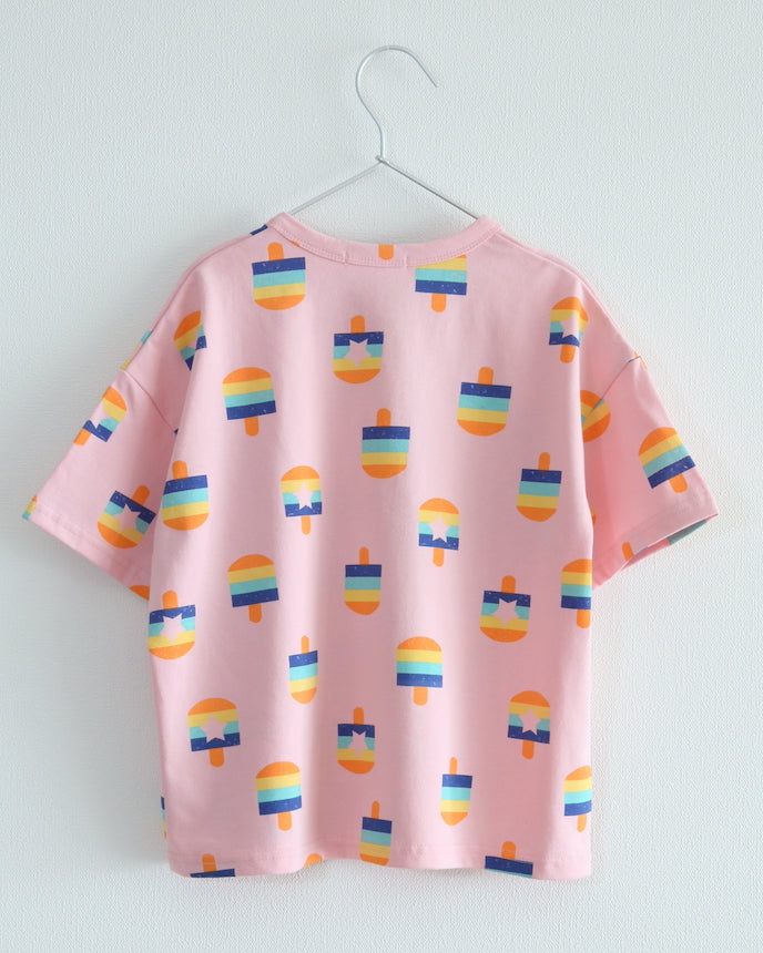 短袖剪裁併用冰棒縫製。五顏六色的冰棒讓你感到甜蜜,會讓孩子們興奮不已。薄薄的 100% 棉材質在出汗的夏天非常有用。不僅推薦日常使用,也推薦外出使用。