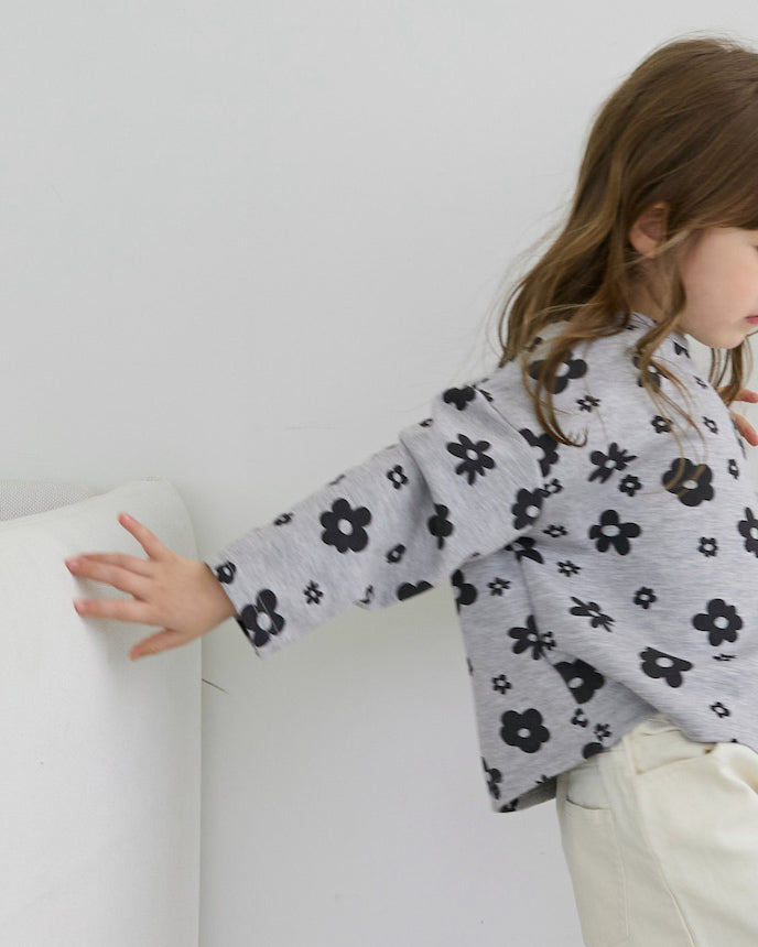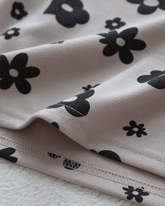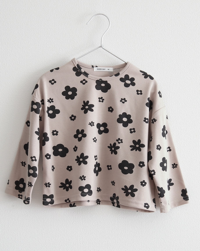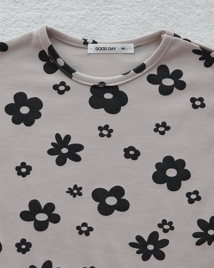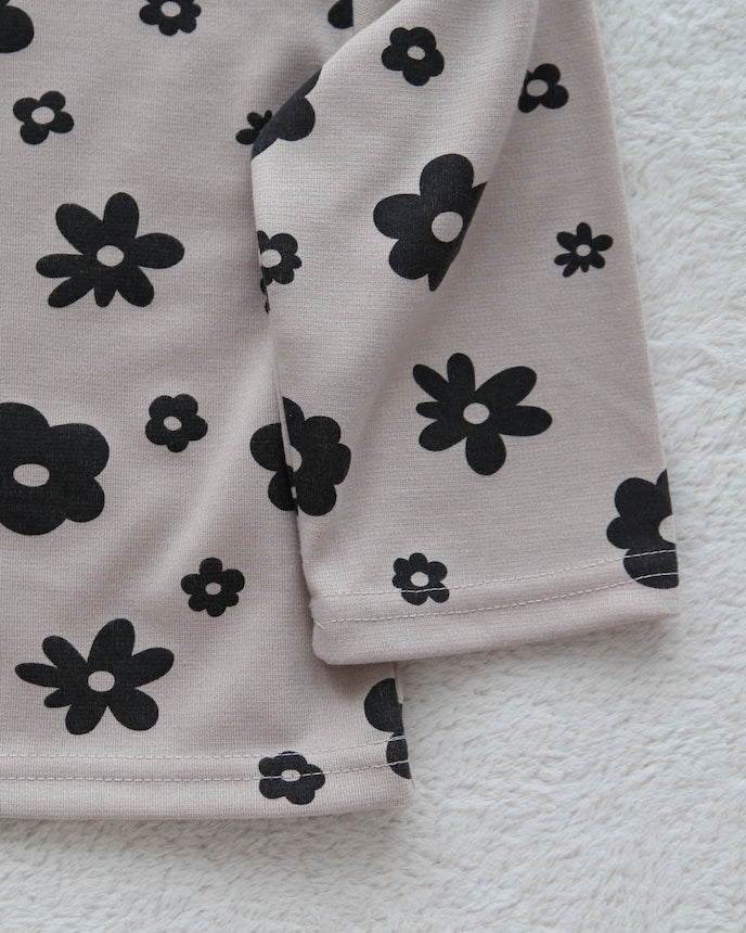 兒童長袖長款 T 卹花朵花卉圖案摩卡棕色