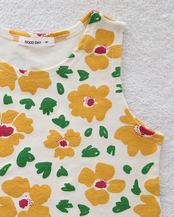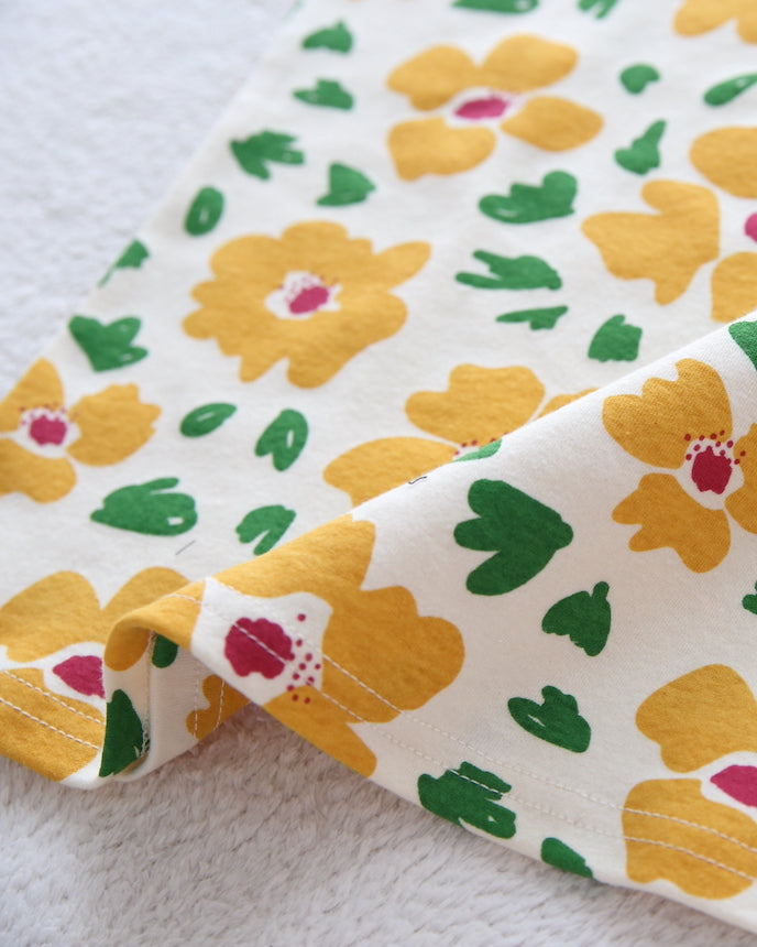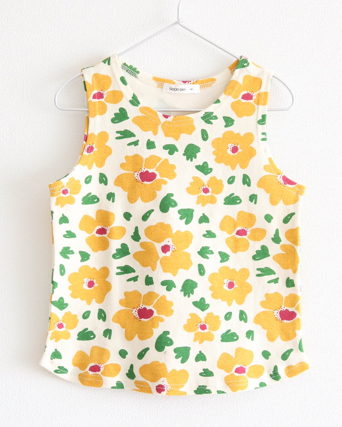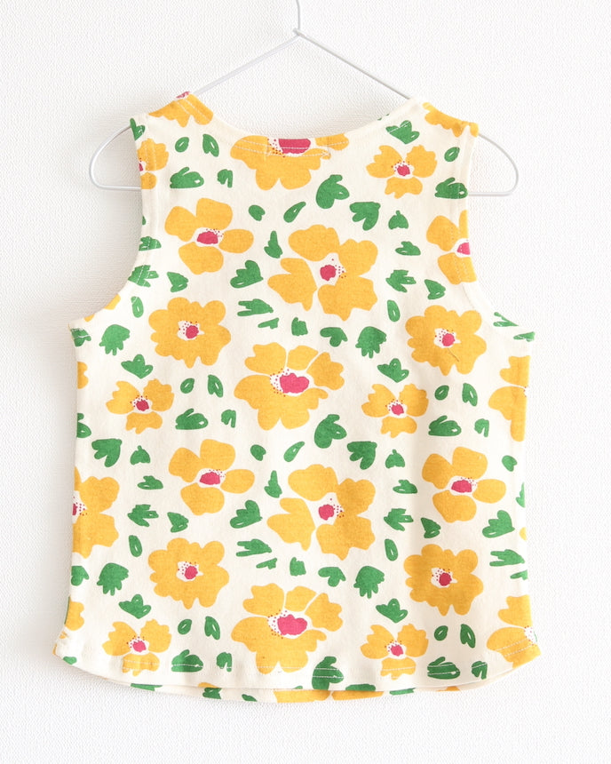 五顏六色的花朵的存在感很突出,是孩子們會喜歡的可愛圖案。這款背心不太浮華,可單獨作為內層穿著,打造層次感。布料手感緊實有彈性,即使活動也不會感到局促,推薦給胖乎乎的孩子。我對底部內外都易於使用的長長度感到滿意。